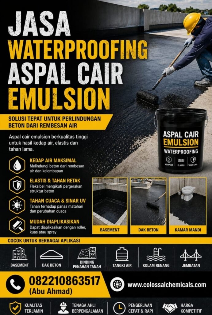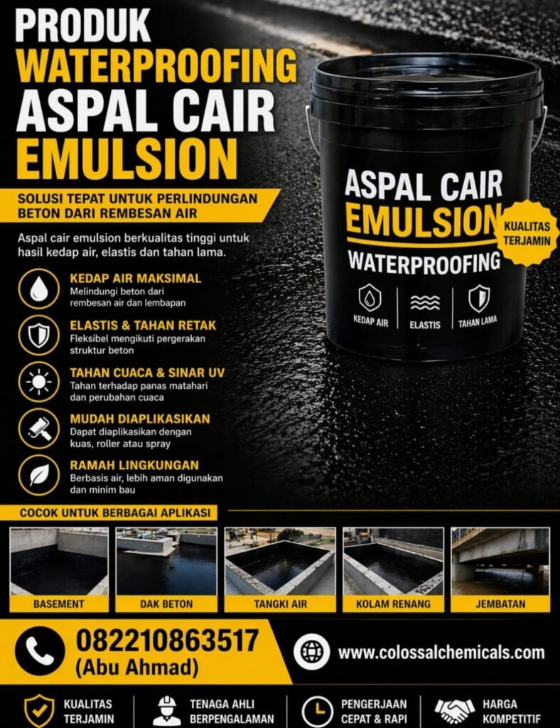 - Untuk pengerjaan proyek Asphalt Cair Emulsion for Waterproofing diperlukan pengalaman dan ketelitian dalam aplikasi produk ini. Aplikasi Asphalt Cair Emulsion for Waterproofing ini mempunyai tingkat keberhasilan menutupi kebocoran 100%.
