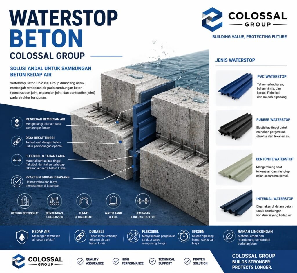 Waterstop adalah salah satu bagian dari waterproof system’ Pekerjaan Konstruksi khusus perbaikan kebocoran terhadap Konstruksi struktur beton dan kami PT. CITRA KOLOSAL ABADI sebagai salah satu perusahaan kontraktor Pekerjaan Waterproofing khusus nya Pekerjaan Waterstop terhadap struktur beton bertulang yang berpengalaman dan profesional di bidang Waterstop.
